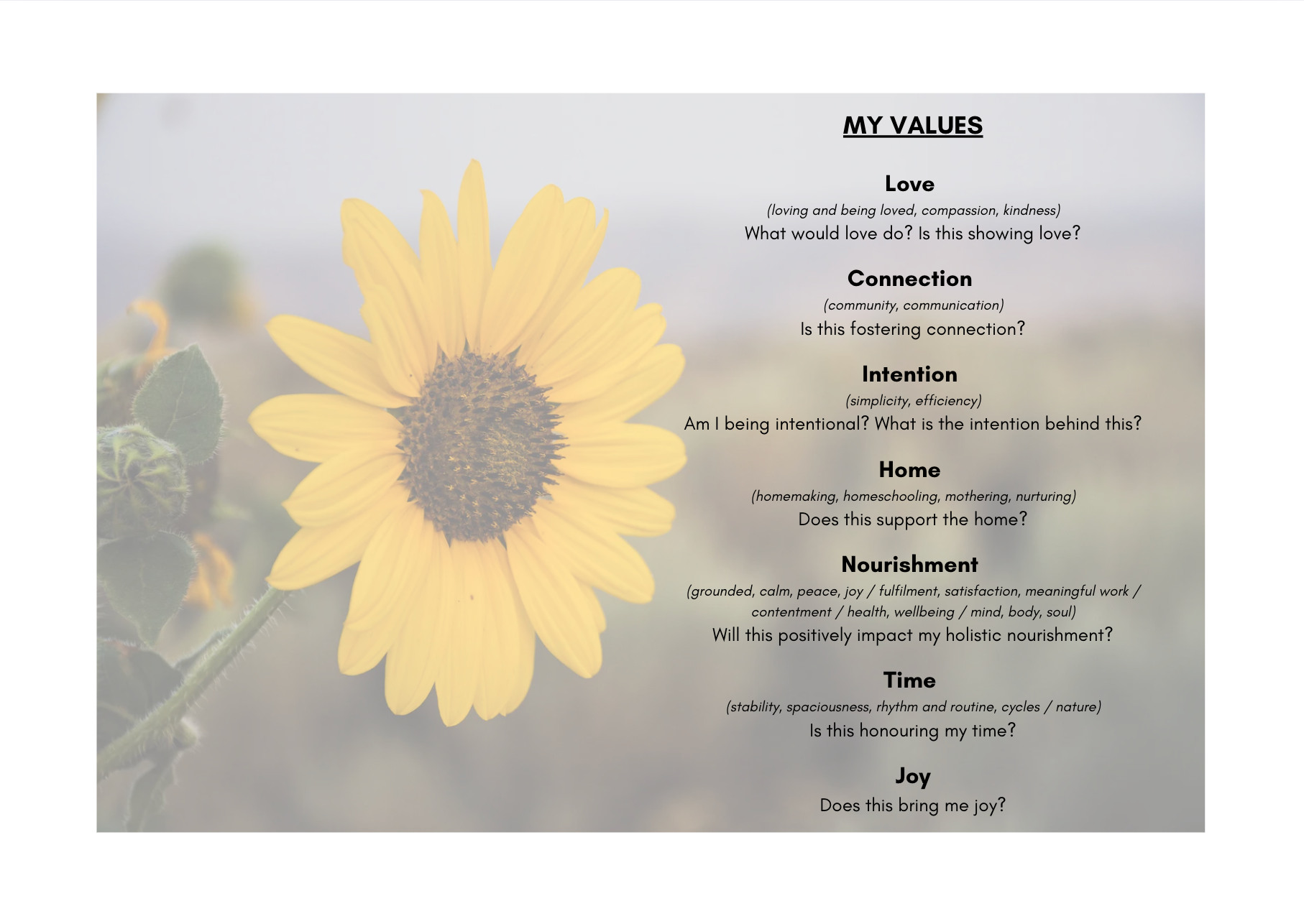 I’ve been writing a yearly vision for a fair few years now, and most of the time they focused on external / materialistic goals. Things that I was working towards and wanting to achieve. This time, I wrote a complete vision based on the person I’d like to be and the way I’d like life to feel. It has felt so grounding in this busy season of life, to have a reminder to exhale and focus on the bigger picture. That there is more to life in what we’re working towards or want to have. I started with some questions to journal on and then crafted a vision based on those journal responses. From there, I went through and pulled out the key themes/desires that came up and grouped those to create my values list.